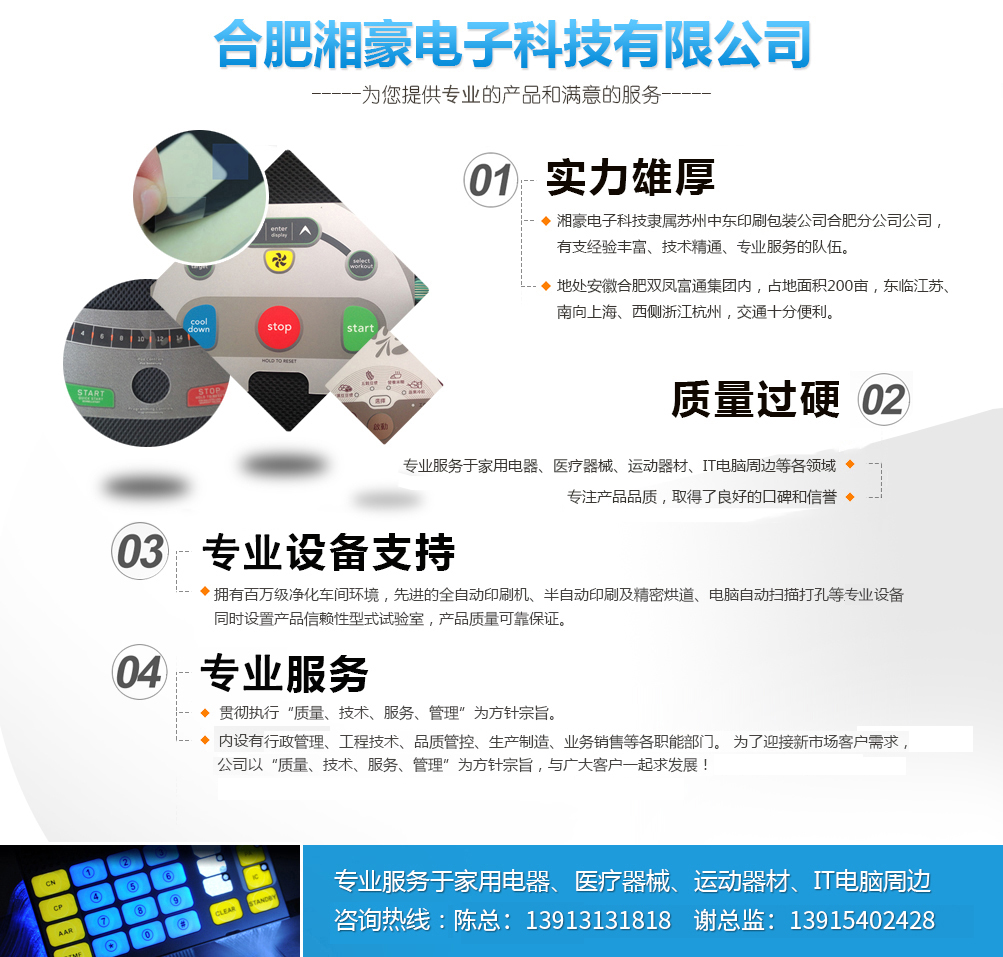公司簡介   合肥湘豪電子科技有限公司系香港中意國際集團股份有限公司(1998年創建)下屬企業,關系企業有:東莞中意塑膠制品有限公司(1996年創建),蘇州中意塑膠制品有限公司(2003年創建),蘇州中東包裝印刷有限公司(2007創建),蘇州捷瑞達自動化科技有限公司(2014年創建),東莞唯道實業有限公司(2014年創建),合肥六九機器人自動化科技有限公司(2015年創建);合作企業有:香港富通工業集團。   公司總部設在經濟發達的香港,總公司這十幾年來先后在東莞,蘇州投資設廠,為滿足合肥市場廣大客戶的需求,總公司于2015年與香港富通工業集團合作在合肥投資設廠,打造電器控制面板,薄膜開關業界的航空母艦,創造專業產品,樹立精品觀念,鍛造高品質、高服務的企業形象,樹立正確的核心價值觀。全心全意為國內外品牌企業服...